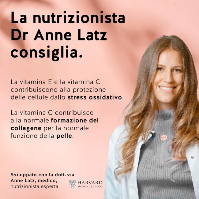 Edulcorante (maltitoli), peptidi di collagene, edulcorante (glicosidi steviolici da stevia), gelatina di maiale, ialuronato di sodio, acido L-ascorbico, acidificante (acido citrico), concentrato di carota, concentrato di ribes nero, coenzima Q10 (ubichinone), aromi naturali, oli vegetali (cocco e colza), DL-alfa-tocoferilacetato, agenti di rivestimento (cera di carnauba, cera d'api bianca e gialla).