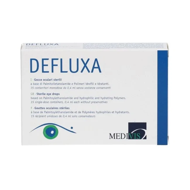 DEFLUXA è una soluzione oftalmica sterile, isotonica a pH fisiologico costituita da palmitoiletanolamide (molecola di natura Lipidica), da polimeri idrofili ed idratanti (acido ialuronico sale sadico, polivinilalcole e ciclodestrina), da glicerolo (molecola ad azione umettante e osmoprotettiva) e da sali minerali.