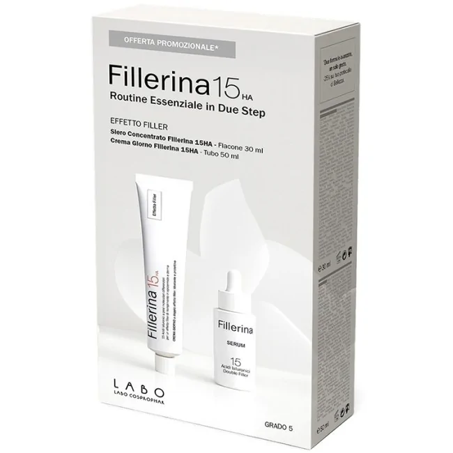 Labo Cofanetto Fillerina 15HA routine essenziale in due step siero concentrato fillerina15HA + crema giorno fillerina15HA grado 5, trattamento a doppio effetto filler riempitivo.