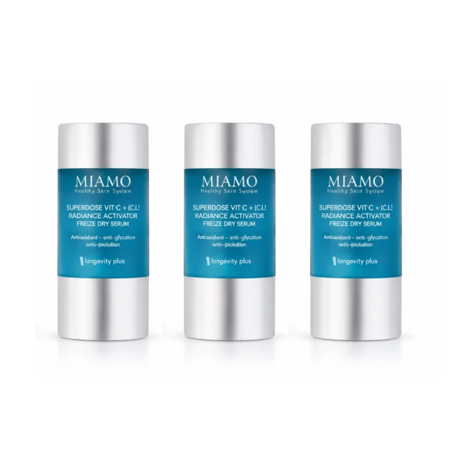 Miamo Longevity Plus Superdose Vit C Radiance Activator Freeze Dry Serum in confezione da 3 flaconcini da 5 ml è il trattamento intensivo illuminante e antiage a base di Vitamina C pura liofilizzata. Grazie alla tecnologia freeze-dry, la vitamina C rimane stabile fino al momento dell’attivazione, garantendo una massima efficacia contro macchie, colorito spento, rughe precoci e perdita di elasticità. Ideale per chi cerca una super-dose antiossidante con risultati visibili e rapidi. Indicazioni cosmetiche per migliorare visibilmente: