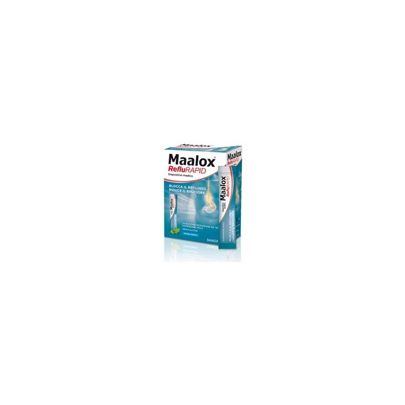 Maalox Replurapid è un dispositivo medico a base di Sodio Alginato, bicarbonato di sodio, sodio carbonato, formulato per svolgere azioni di: