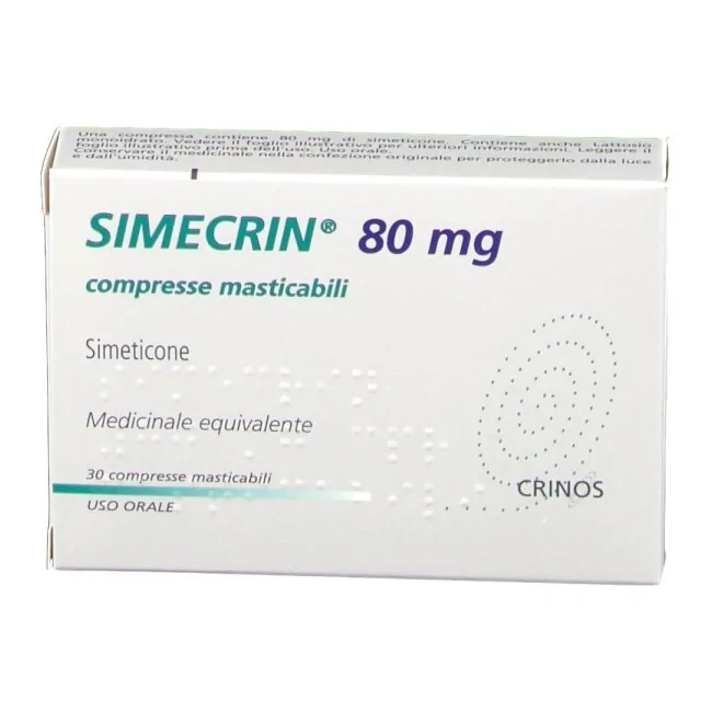Simecrin 80 mg compresse masticabili Una compressa contiene Principio attivo: simeticone mg 80 Eccipiente con effetti noti: 317,6 mg di lattosio.