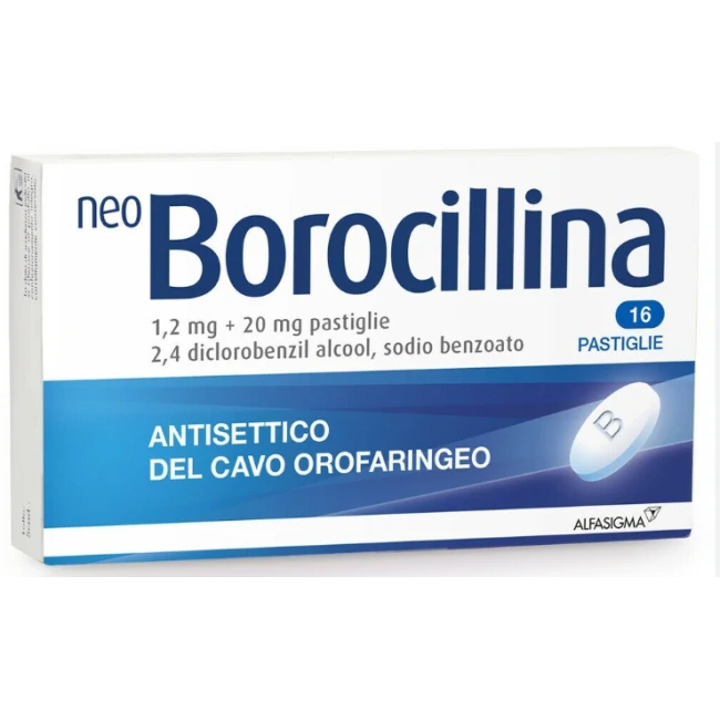 Neo Borocillina pastiglie contiene i principi attivi 2,4 diclorobenzil alcool e sodio benzoato ed appartiene ad una categoria di farmaci detti antisettici (antibatterici) del cavo orofaringeo (bocca e gola), utilizzati per la cura dei sintomi delle malattie infiammatorie della bocca e della gola.