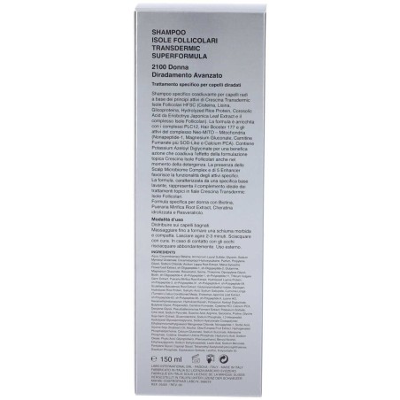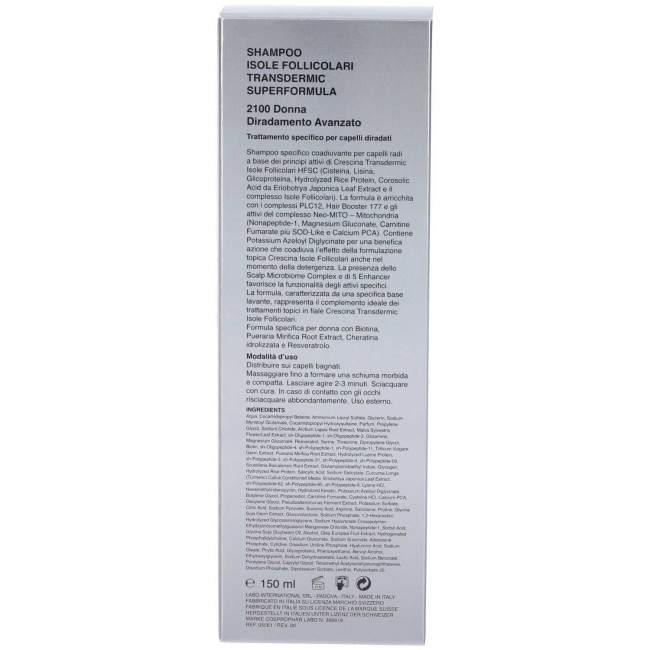 Labo Shampoo Crescina isole follicolari Superformula 2100 Donna shampoo specifico coadiuvante per capelli radi a base dei principi attivi di crescina transdermic isole follicolari HFSC (cisteina, lisina, glicoproteina, hydrolyzed rice protein, corosolic acid da Eriobotrya japonica leaf extract e il complesso Isole Follicolari). La formula è arricchita con i complessi PLC12, Hair Booster 177 e gli attivi del complesso Neo-MITO - Mitochondria (nonapeptide-1, magnesium gluconate, carnitine fumarate più SOD-Like e calcium PCA). Contiene Potassium Azeloyl Diglycinate per una benefica azione che coadiuva l'effetto della formulazione topica Crescina Isole Follicolari anche nel momento della detergenza. La presenza dello Scalp Microbiome Complex e di 5 Enhancer favorisce la funzionalità degli attivi specifici.