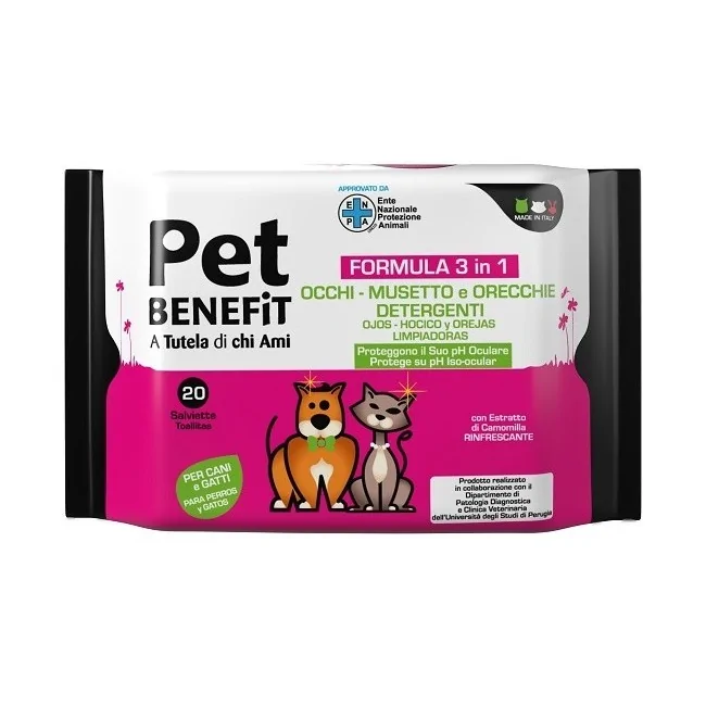 Le salviette detergenti PET BENEFIT, studiate per l’igiene quotidiana di occhi, musetto e orecchie di cani e gatti, sono ideali per rimuovere polvere, secrezioni ed impurità nel rispetto del pH iso-oculare e per non creare irritazioni né arrossamenti durante l'uso. La loro formulazione prettamente detergente è stata arricchita con estratto di camomilla, dall’azione rinfrescante e delicata. La profumazione leggera non disturba l’animale né le persone che gli sono accanto.