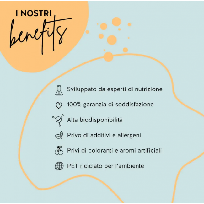 edulcoranti (maltitolo, isomalto), agenti gelificanti (glicerolo, pectine), inulina, acidificanti (acido citrico, acido ascorbico), regolatori dell’acidità (citrati di sodio, fosfato tricalcico), olio di cocco, emulsionante (esteri di saccarosio degli acidi grassi), aroma naturale di arancia, Bacillus coagulans BC99, olio di semi di girasole, succo concentrato di carota viola, colorante (beta-carotene), cloridrato di piridossina, agente di rivestimento (cera di carnauba).