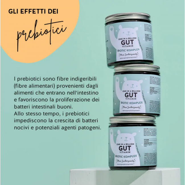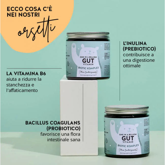 Bears with benefits One in a billion gut Vitamin Probioticiè unintegratore alimentare vegano ideale per il benessere dell'intestino e del sistema immunitariodalla particolare forma di orsetti gommosi, a base di: