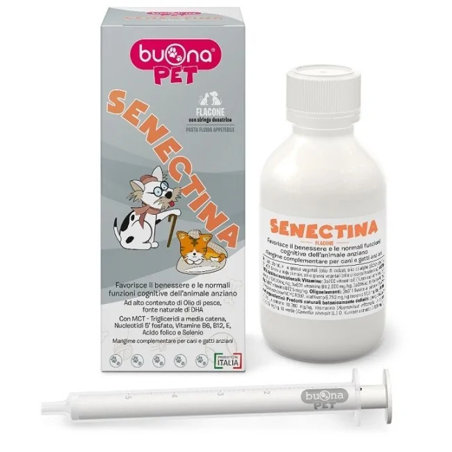 Agitare energeticamente il flacone a tappo chiuso prima di ogni utilizzo, per almeno 30 secondi. All’interno del flacone sono presenti 2 sfere in acciaio che contribuiscono a miscelare uniformemente i componenti di SENECTINA. Per prelevare il prodotto, svitare il tappo ed inserire la siringa nell’apposito adattatore. Mantenere sempre l’adattatore sul tappo durante il prelievo per impedire la fuoriuscita accidentale delle sfere e l’eventuale ingestione da parte dell’animale. Capovolgere il flacone ed estrarre la razione giornaliera indicata in tabella. Riposizionare il flacone in verticale, rimuovere la siringa e richiudere il flacone. Somministrare il prodotto direttamente in bocca all’animale o disperso nel cibo gradito. Completare la razione giornaliera con l’alimento abituale. Lasciare sempre acqua fresca a disposizione.