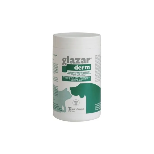 Teknofarma Glazarderm Polvere Premiscela per Cani e Gattiè un prodotto formulato per compensare carenze alimentari (vitaminiche, minerali, di aminoacidi essenziali solforati e soprattutto di acidi grassi essenziali Omega-3 e Omega 6) che si manifestano con la comparsa di problemi cutanei (seborrea, forfora, pelle secca, alopecie carenziali, pelo opaco e caduco, reazioni infiammatorie eccessive, problemi cutanei su base allergica).