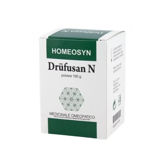Homeosyn Italia Drufusan N – Polvere è un prodotto in bustine monodose a base di una miscela di ingredienti omeopatici (tra cui Acidum silicicum, Calcium fluoratum, Ferrum phosphoricum, Kalium sulfuricum, Natrium phosphoricum e altri sali minerali). Viene talvolta proposto come supporto rimineralizzante, ma è classificato come medicinale omeopatico senza indicazioni terapeutiche approvate.