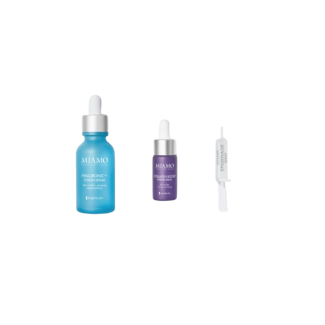 Miamo Cofanetto Plump&fill Hyaluronic 14+ Fusion Serum 30 Ml + Collagen Boost Intense Serum 10 Ml + Epigenage Shot 1 Ml ideale in caso di rughe di disidratazione, pelle secca e perdita di volume.