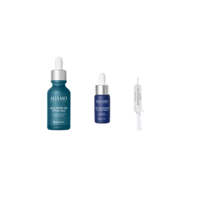 Miamo Cofanetto Lift&aox Multi Peptide 20% Lifting Serum 30 Ml + Gf5 Glutathione Aox Boost Serum 10 Ml + Epigenage Shot 1ml ideale in caso di rughe, perdita di elasticità e colorito spento.