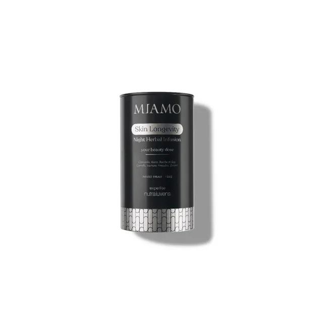 Miamo Skin Longevity Infuso Erbale Biologico è una formulazione in foglie per tisane con estratti biologici e naturali selezionati di Camomilla, Ibisco, Bacche di Goji, Cannella Ceylon, Liquirizia, Finocchio, Zenzero. Contiene inoltre Menta Verde, Scorza D’Arancia, Chiodi di Garofano, Anice, Pepe rosa e Cardamomo. L'infuso erbale è la combinazione perfetta che favorisce una corretta digestione, che riduce i gonfiori addominali, che migliora il sistema immunitario, calma lo stress e che favorisce un sonno ristoratore. Una formulazione a 360° che favorisce il benessere quotidiano.