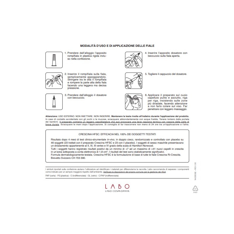 - Aprire la fialetta e versarlo sul cuoio capelluto soprattutto nelle zone più diradate.