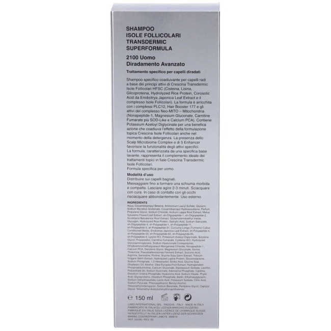 Labo Shampoo Crescina isole follicolari Superformula 2100 UomoShampoo specifico coadiuvante per capelli radi a base deiprincipi attivi di Crescina Transdermic Isole Follicolari HFSC (Cisteina, Lisina, Glicoproteina, Hydrolyzed Rice Protein, Corosolic Acid da Eriobotrya Japonica Leaf Extract e il complesso Isole Follicolari). La formula è arricchita con i complessi PLC12, Hair Booster 177 e gli attivi del complesso Neo-MITO – Mitochondria (Nonapeptide-1, Magnesium Gluconate, Carnitine Fumarate più SOD-Like e Calcium PCA). Contiene Potassium Azeloyl Diglycinate per una benefica azione che coadiuva l’effetto della formulazione topicaCrescina Isole Follicolari anche nel momento della detergenza. La presenza dello Scalp Microbiome Complex e di 5 Enhancer favorisce la funzionalità degli attivi specifici.