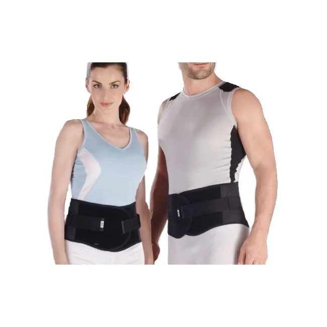 Chiusura anteriore a strappo con pelota addominale in polietilene rigida removibile.